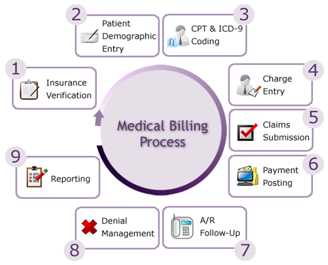 We follow a process that includes steps such as Insurance Eligibility Verification, Patient Demographic Entry, CPT/ ICD-10 Coding, Charge Entry, Claims Submission, Accounts Receivables Follow-up, Payment Posting, Denial Analysis, and Accounts Receivables Management.